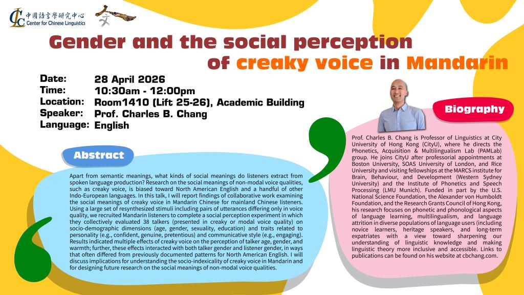 Apart from semantic meanings, what kinds of social meanings do listeners extract from spoken language production? Research on the social meanings of non-modal voice qualities, such as creaky voice, is biased toward North American English and a handful of other Indo-European languages. In this talk, I will report findings of collaborative work examining the social meanings of creaky voice in Mandarin Chinese for mainland Chinese listeners. Using a large set of resynthesized stimuli including pairs of utterances differing only in voice quality, we recruited Mandarin listeners to complete a social perception experiment in which they collectively evaluated 38 talkers (presented in creaky or modal voice quality) on socio-demographic dimensions (age, gender, sexuality, education) and traits related to personality (e.g., confident, genuine, pretentious) and communicative style (e.g., engaging). Results indicated multiple effects of creaky voice on the perception of talker age, gender, and warmth; further, these effects interacted with both talker gender and listener gender, in ways that often differed from previously documented patterns for North American English. I will discuss implications for understanding the socio-indexicality of creaky voice in Mandarin and for designing future research on the social meanings of non-modal voice qualities.
