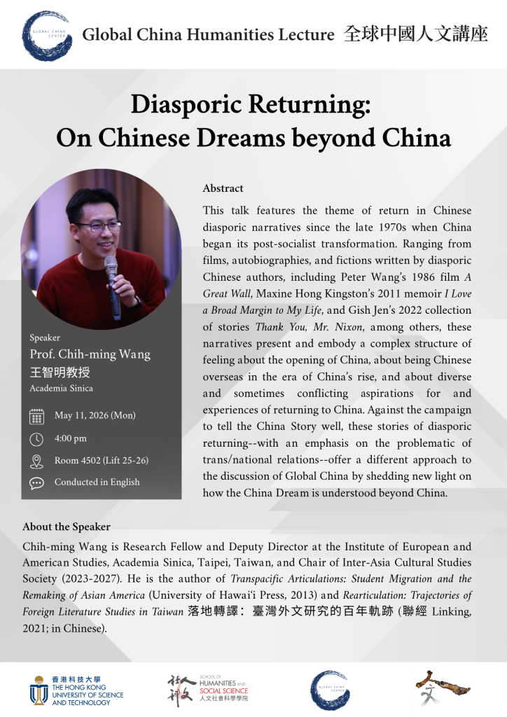 This talk features the theme of return in Chinese diasporic narratives since the late 1970s when China began its post-socialist transformation. Ranging from films, autobiographies, and fictions written by diasporic Chinese authors, including Peter Wang’s 1986 film A Great Wall, Maxine Hong Kingston’s 2011 memoir I Love a Broad Margin to My Life, and Gish Jen’s 2022 collection of stories Thank You, Mr. Nixon, among others, these narratives present and embody a complex structure of feeling about the opening of China, about being Chinese overseas in the era of China’s rise, and about diverse and sometimes conflicting aspirations for and experiences of returning to China. Against the campaign to tell the China Story well, these stories of diasporic returning--with an emphasis on the problematic of trans/national relations--offer a different approach to the discussion of Global China by shedding new light on how the China Dream is understood beyond China.