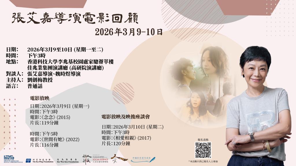 張艾嘉,著名演員、編劇、導演及監製。七十年代於港台兩地開展其演藝事業,從影五十多年,主演超過一百部電影,憑藉《最愛》(1986)榮獲第6屆香港電影金像獎最佳女主角。除了演出的作品深入民心,作為編劇及導演,張艾嘉亦極具影響力。1981年,首次執導《舊夢不須記》,編導作品包括《最愛》(1986)、《心動》(1999)《20-30-40》(2004)、《念念》(2015)等,並憑《相愛相親》(2017)分別奪得第37屆香港電影金像獎最佳編劇(與游曉穎合編)、第12屆香港電影導演會年度大獎最佳導演,以及第12屆亞洲電影大獎最佳女主角,並同時獲頒終身成就獎。她導演的電影曾多次受邀於不同的國際影展,包括柏林電影節、倫敦電影節、多倫多電影節、釜山電影節等。